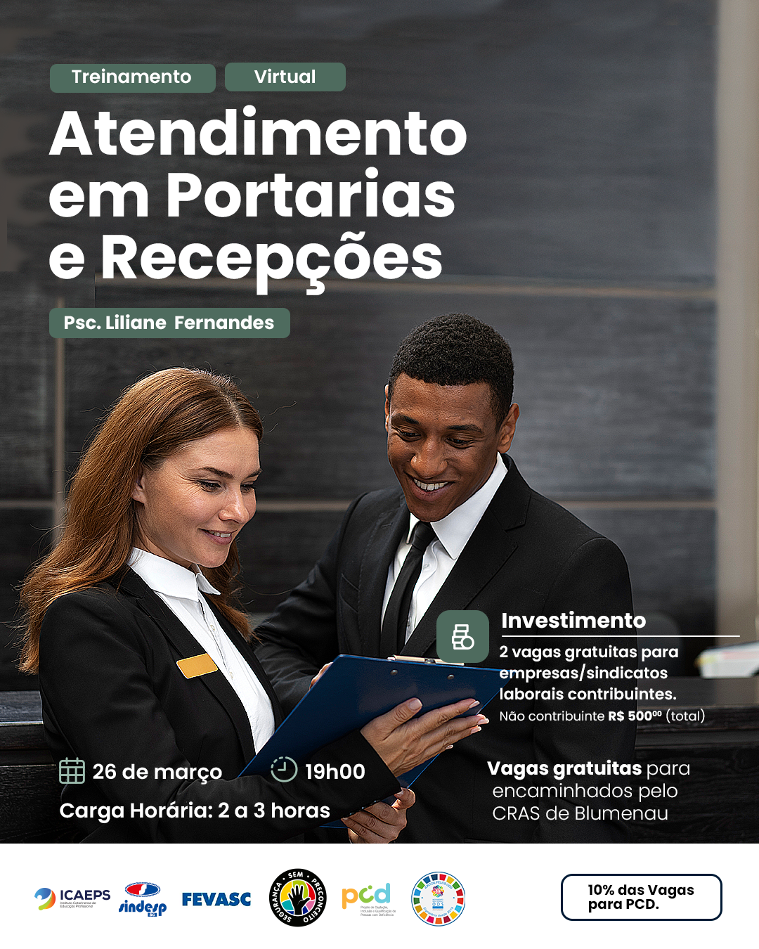 O Curso de Qualidade no Atendimento em Portarias e Recepções é mais um treinamento oferecido pelo ICAEPS. O evento ocorrerá no dia 26 de março, a partir das 19h. A professora Liliane Fernandes, psicóloga e consultora de desenvolvimento humano, comandará a palestra.