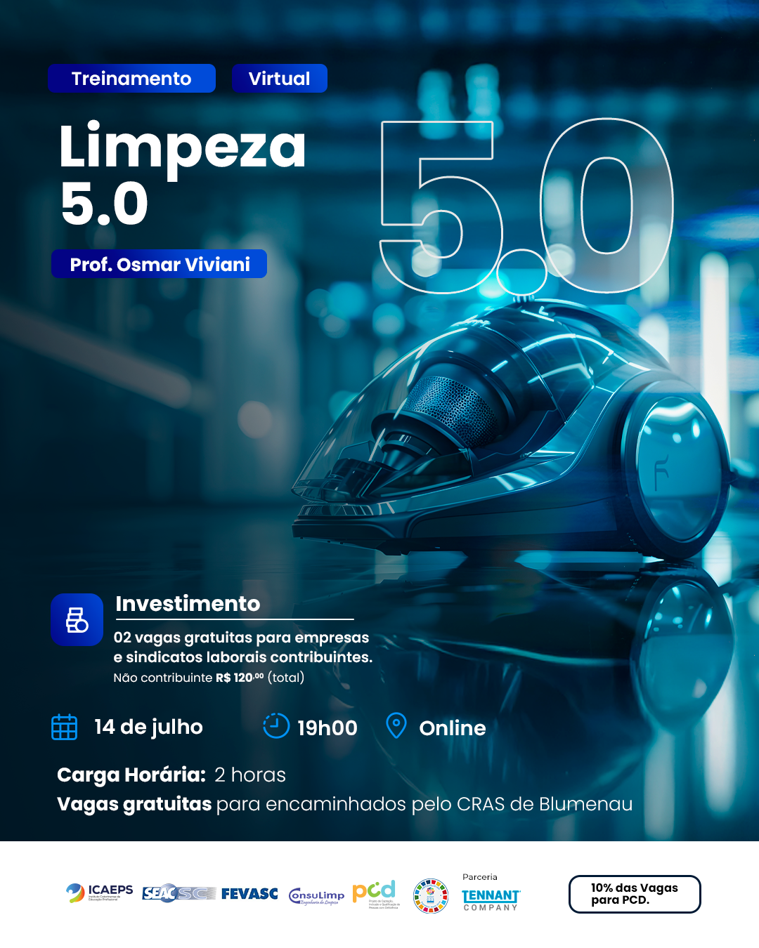 No mês de julho tem treinamento virtual com o professor Osmar Viviani. Voltado à Limpeza 5.0, o evento será promovido pelo ICAEPS, em parceria com o SEAC-SC e a Consulimp.