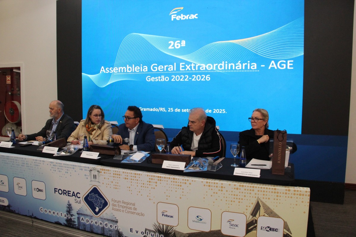 A Assembleia Geral Extraordinária (AGE) da Febrac foi realizada nesta quinta-feira, 25 de setembro, em Gramado. O encontro abriu os trabalhos da semana em que se realiza o Fórum Regional das Empresas de Asseio e Conservação (FOREAC Sul) na Serra Gaúcha.