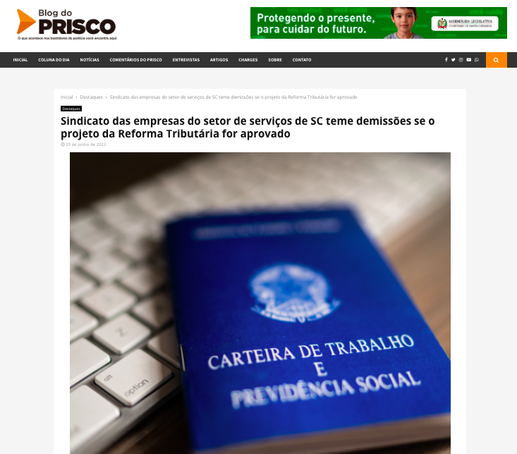 Sindicato das empresas do setor de serviços de SC teme demissões se o projeto da Reforma Tributária for aprovado. Confira matéria completa divulgada no Blog do Prisco: https://www.blogdoprisco.com.br/sindicato-das-empresas-do-setor-de-servicos-de-sc-teme-demissoes-se-o-projeto-da-reforma-tributaria-for-aprovado/