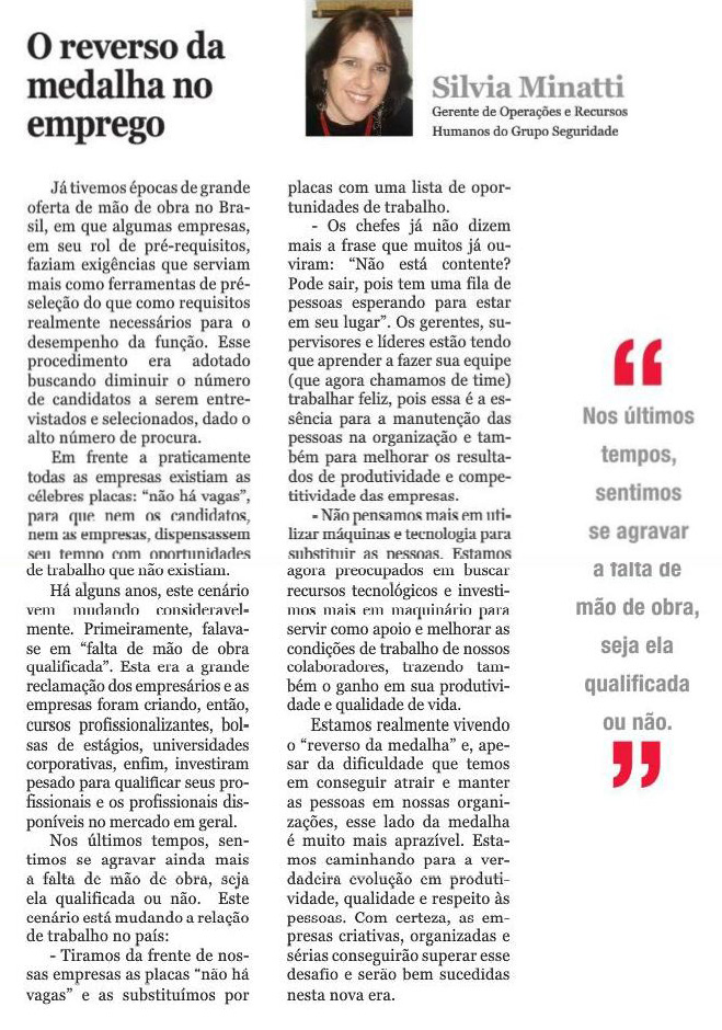 Artigo de Silvia Minatti, gerente de operações e recursos humanos do Grupo Seguridade, é publicado no jornal Notícias do Dia. O texto discute as mudanças nas relações de trabalho, em que se verifica a substituição da grande oferta de mão-de-obra pelo crescimento no número de oportunidades. Agora, o importante é valorizar o funcionário.